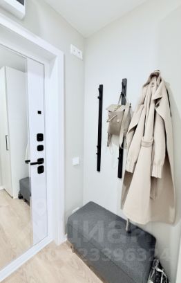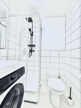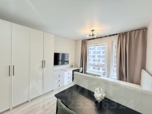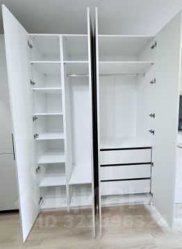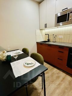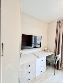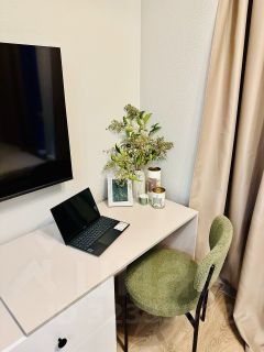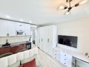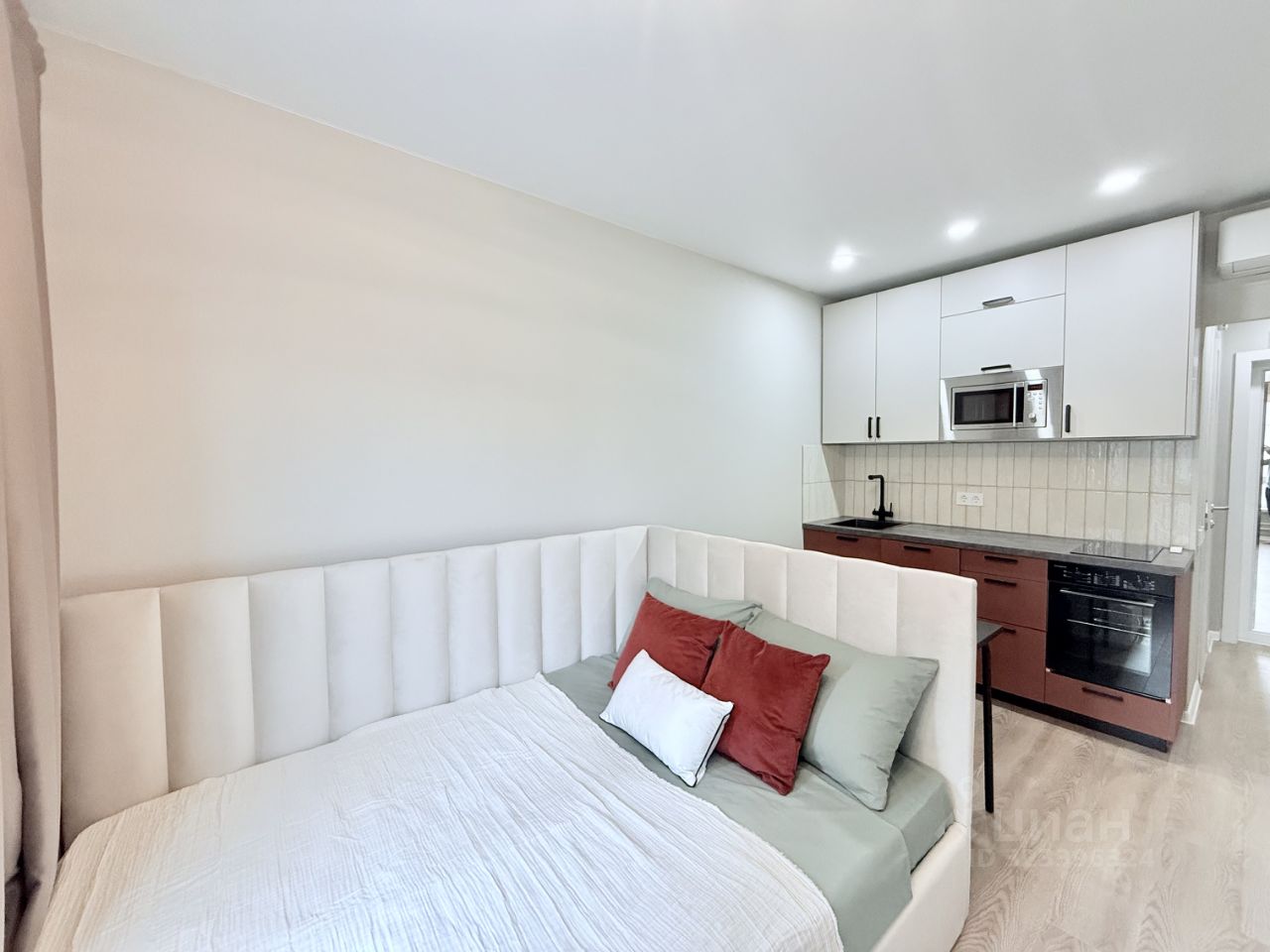 Студия оборудована всем необходимым для проживания: кровать с ортопедическим матрасом, функциональные шкафы, встроенная техника (холодильник, посудомоечная машина, свч и варочная панель). Установлен кондиционер.