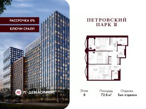 Продаётся 2-комнатная квартира 72.8 кв.м. в ЖК "Петровский парк II" на 8-м этаже 17 этажного дома.