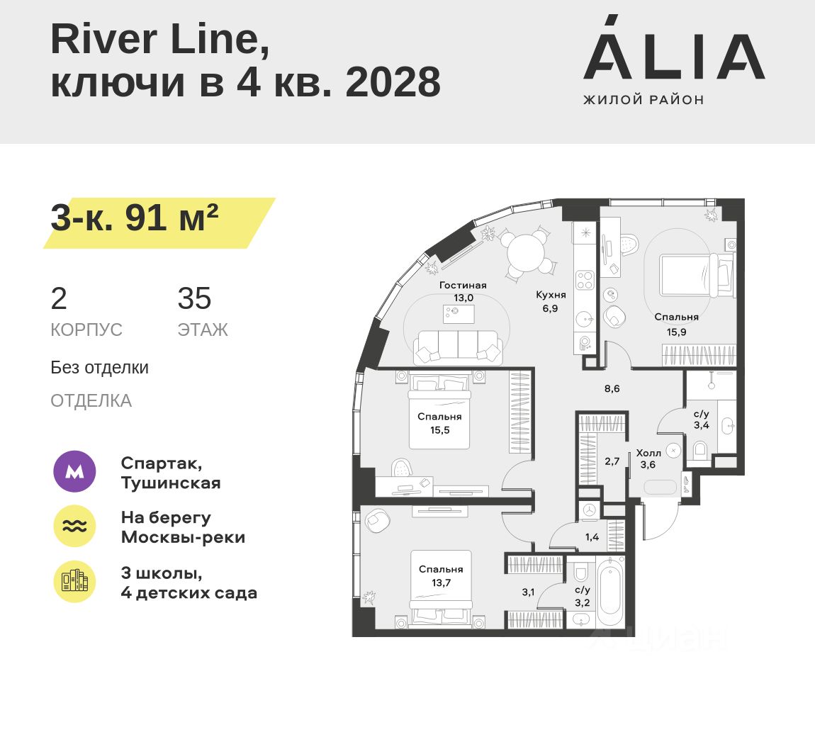 Одна из самых ярких и впечатляющих частей жилого района ALIA — премиальный квартал ALIA ALIVE. Это две башни LIGHTHOUSE от бюро APEX на первой береговой линии Москвы-реки с закрытым внутренним двором, детскими и спортивными площадками. Во всех квартирах — высокие потолки и панорамные окна, из которых открываются вдохновляющие виды на реку и зеленые массивы парков. Среди редких форматов — квартиры с террасой, двухуровневые квартиры и пентхаусы.