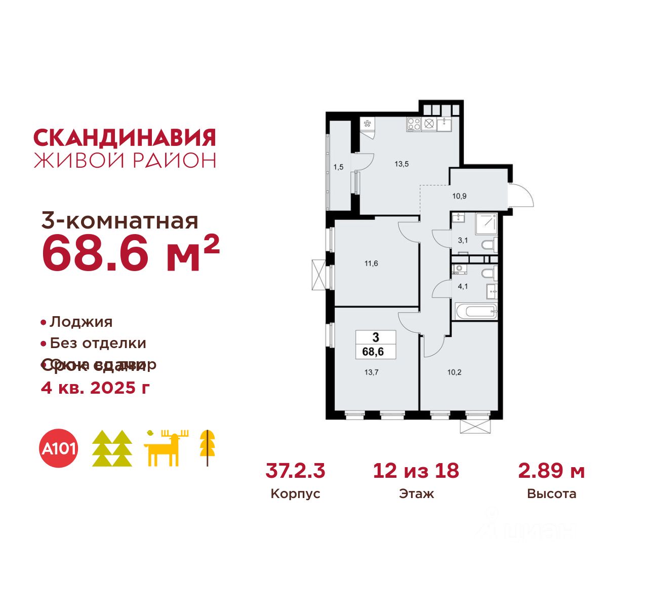 Продается трехкомнатная квартира  489 в новостройке Жилой район "Скандинавия" по адресу Москва, ТиНАО, Новомосковский АО, Сосенское С/П, Коммунарка пос., жилой комплекс Скандинавия, 37.2.3, район Коммунарка, Новомосковский административный округ, Москва. Общая площадь квартиры - 68.60 кв. м., этаж 12 из 18, секция 3. Тип проекта, по которому построен дом - монолит, компания-застройщик - ООО "А101". Стоимость квартиры - 23883090 Р. Срок сдачи - 1 квартал 2026.