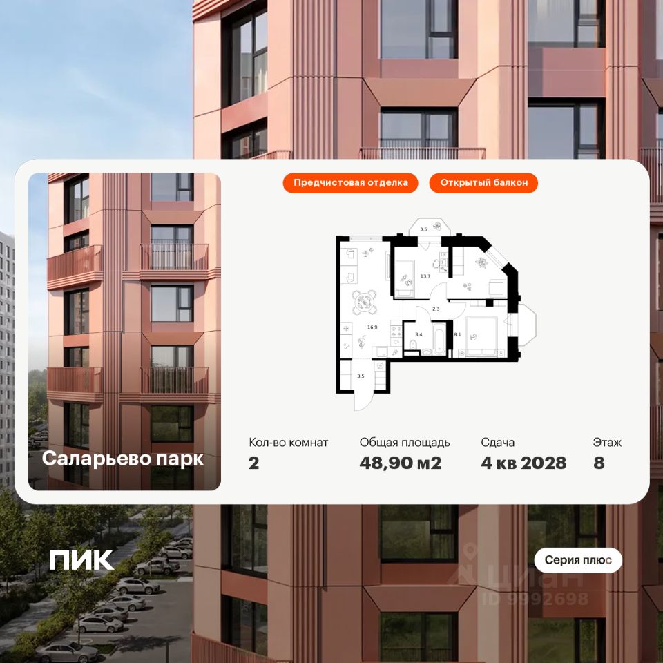 Продаётся 2-комн. квартира площадью 48,9 кв.м на 8 этаже 24 этажного дома (Корпус 82.4, Секция 4) проекта ПИК Саларьево парк. Светлый просторный подъезд на уровне земли, функциональная планировка, большие окна, предчистовая отделка.