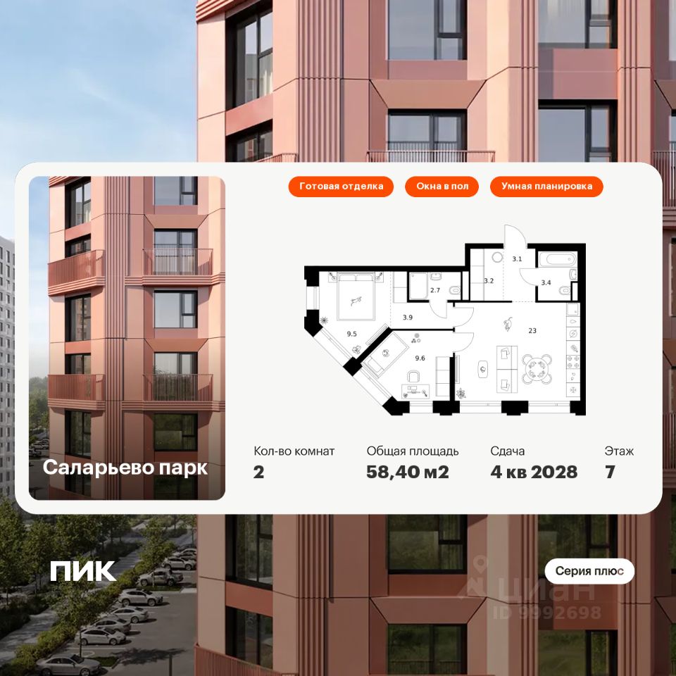 Продаётся 2-комн. квартира площадью 58,4 кв.м на 7 этаже 24 этажного дома (Корпус 82.8, Секция 8) проекта ПИК Саларьево парк. Светлый просторный подъезд на уровне земли, функциональная планировка, большие окна, c отделкой.