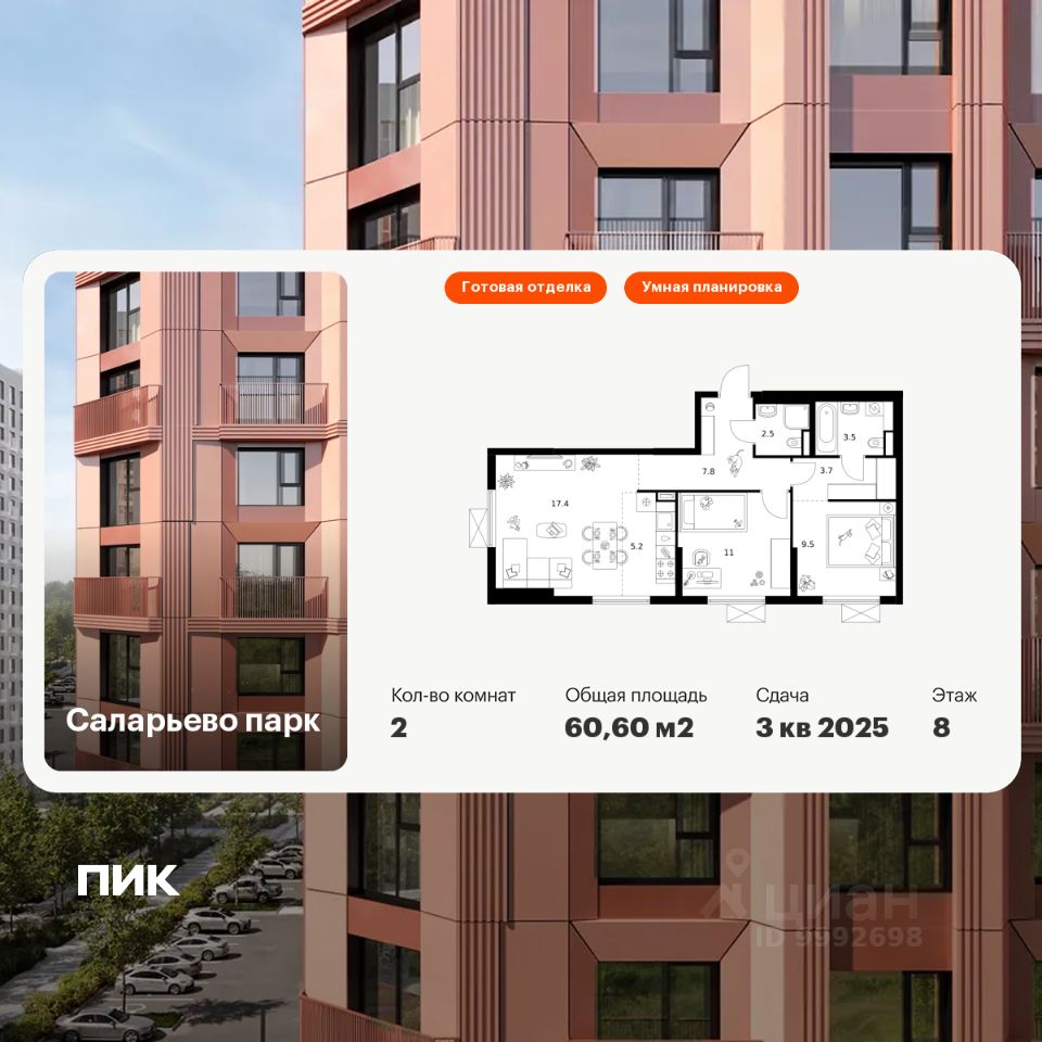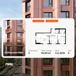 Продаётся 2-комн. квартира площадью 60,6 кв.м на 8 этаже 24 этажного дома (Корпус 68.5, Секция 5) проекта ПИК Саларьево парк. Светлый просторный подъезд на уровне земли, функциональная планировка, большие окна, c отделкой.