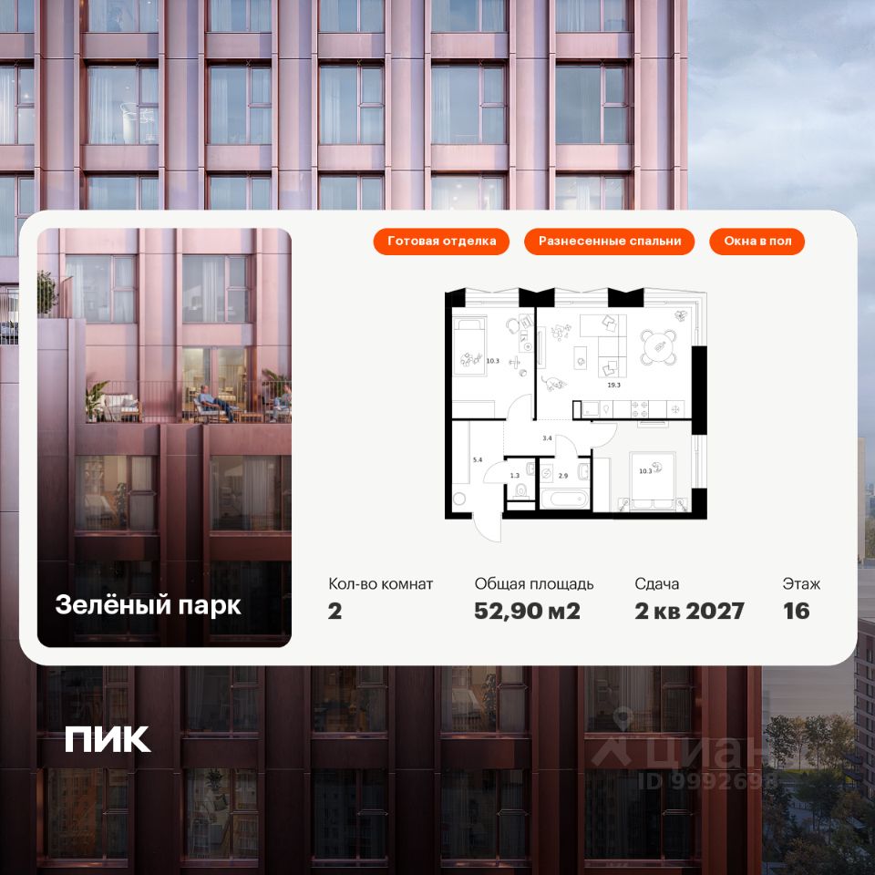 Продаётся 2-комн. квартира площадью 52,9 кв.м на 16 этаже 28 этажного дома (Корпус 6.6, Секция 5) проекта ПИК Зелёный парк. Светлый просторный подъезд на уровне земли, функциональная планировка, большие окна, c отделкой.