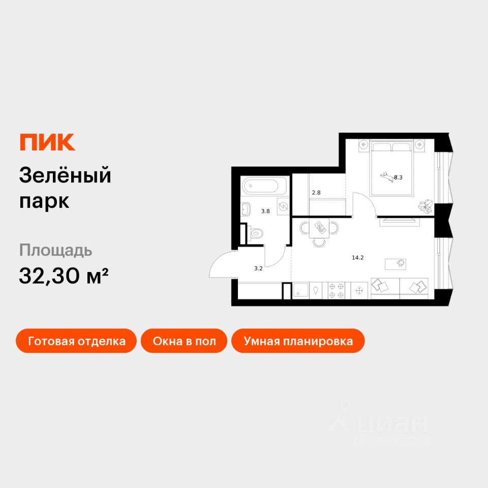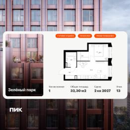 Продаётся 1-комн. квартира площадью 32,3 кв.м на 13 этаже 28 этажного дома (Корпус 6.6, Секция 5) проекта ПИК Зелёный парк. Светлый просторный подъезд на уровне земли, функциональная планировка, большие окна, c отделкой.
