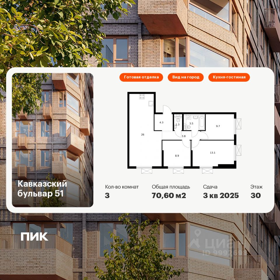 Продаётся 3-комн. квартира площадью 70,6 кв.м на 30 этаже 33 этажного дома (Корпус 1.5, Секция 1) проекта ПИК Кавказский бульвар 51. Светлый просторный подъезд на уровне земли, функциональная планировка, большие окна, c отделкой.