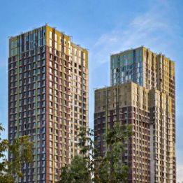 Комплекс состоит из трех корпусов разной высоты — от 22 до 34 этажей. Каждая башня разделена на два объема: один выполнен в темно-коричневом цвете, другой — в теплых белых тонах.