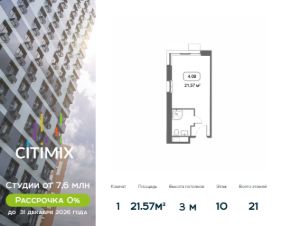 Продаётся студия в строящемся доме (Корпус 4), срок сдачи: III-кв. 2026, общей площадью 21.57 кв.м., на 10 этаже.
