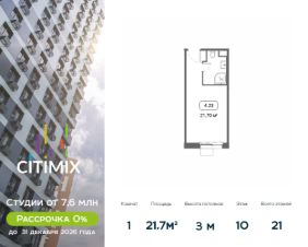 Продаётся студия в строящемся доме (Корпус 4), срок сдачи: III-кв. 2026, общей площадью 21.7 кв.м., на 10 этаже.