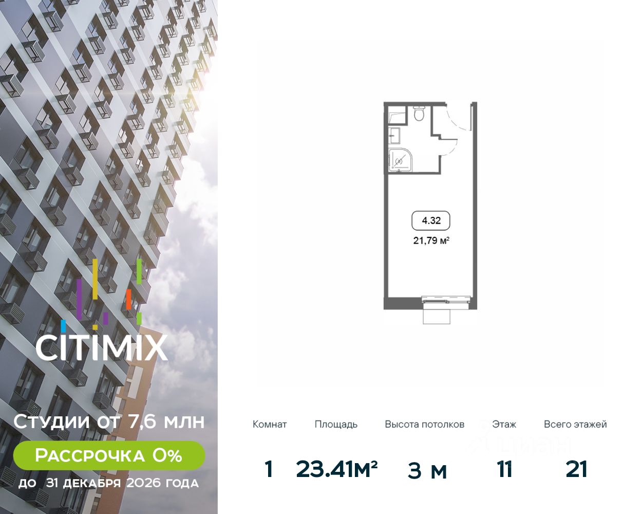 Продаётся студия в строящемся доме (Корпус 4), срок сдачи: III-кв. 2026, общей площадью 23.41 кв.м., на 11 этаже.