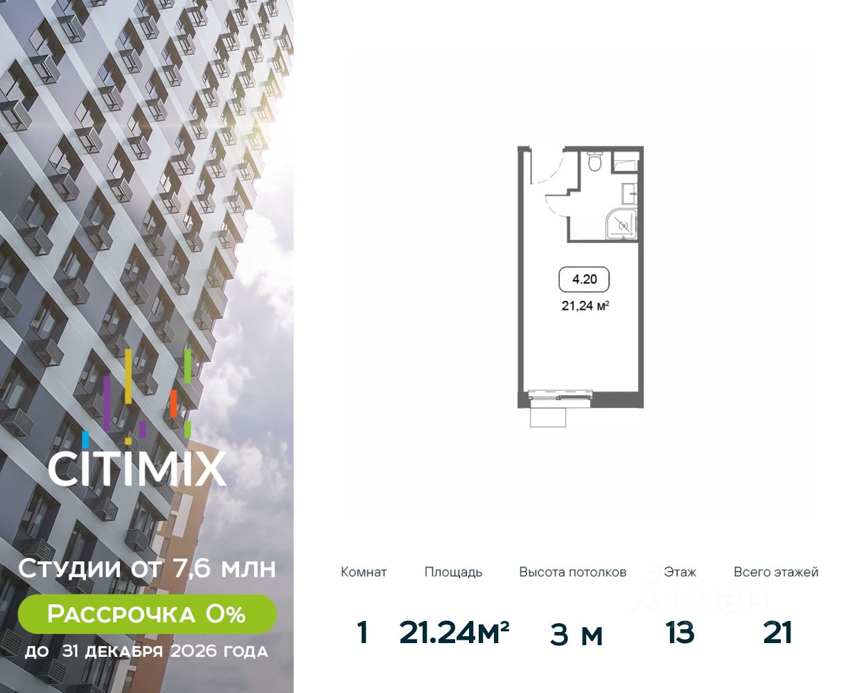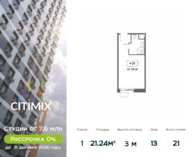 Продаётся студия в строящемся доме (Корпус 4), срок сдачи: III-кв. 2026, общей площадью 21.24 кв.м., на 13 этаже.