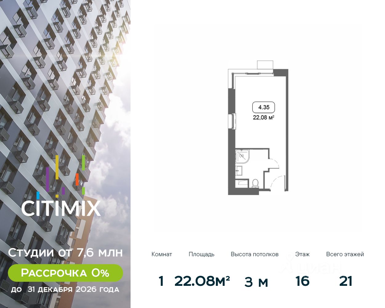 Продаётся студия в строящемся доме (Корпус 4), срок сдачи: III-кв. 2026, общей площадью 22.08 кв.м., на 16 этаже.