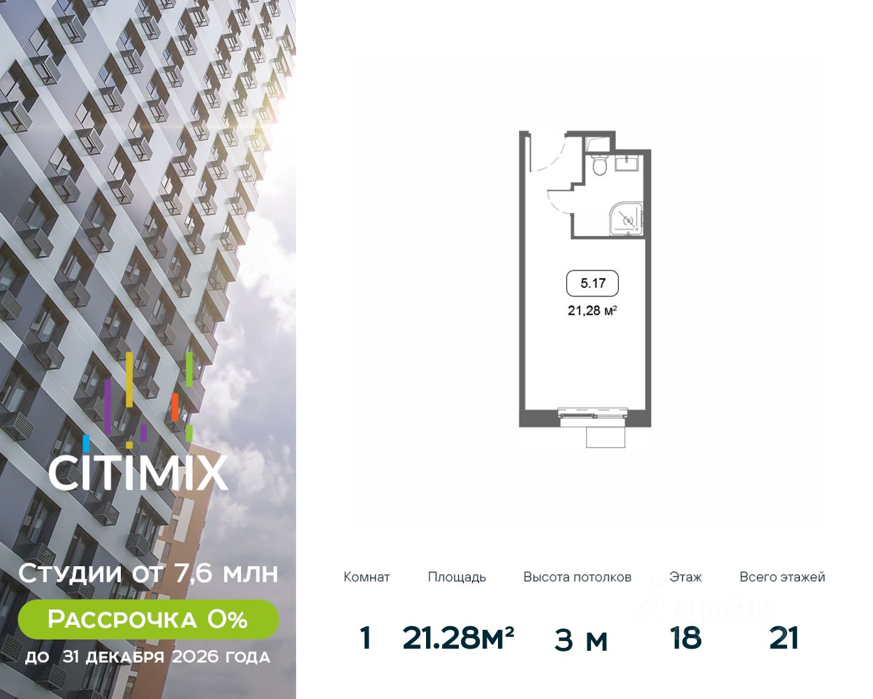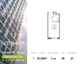 Продаётся студия в строящемся доме (Корпус 5), срок сдачи: III-кв. 2026, общей площадью 21.28 кв.м., на 18 этаже.