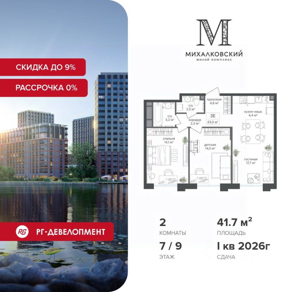 Скидка 9% при покупке квартиры! Цена указана с учетом максимального размера скидки.