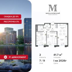 Продаётся 2-к квартира 41,7 кв.м. в ЖК "Михалковский" на 7-м этаже 9 этажного дома.