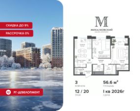 Продаётся 3-к квартира 56,6 кв.м. в ЖК "Михалковский" на 12-м этаже 20 этажного дома.
