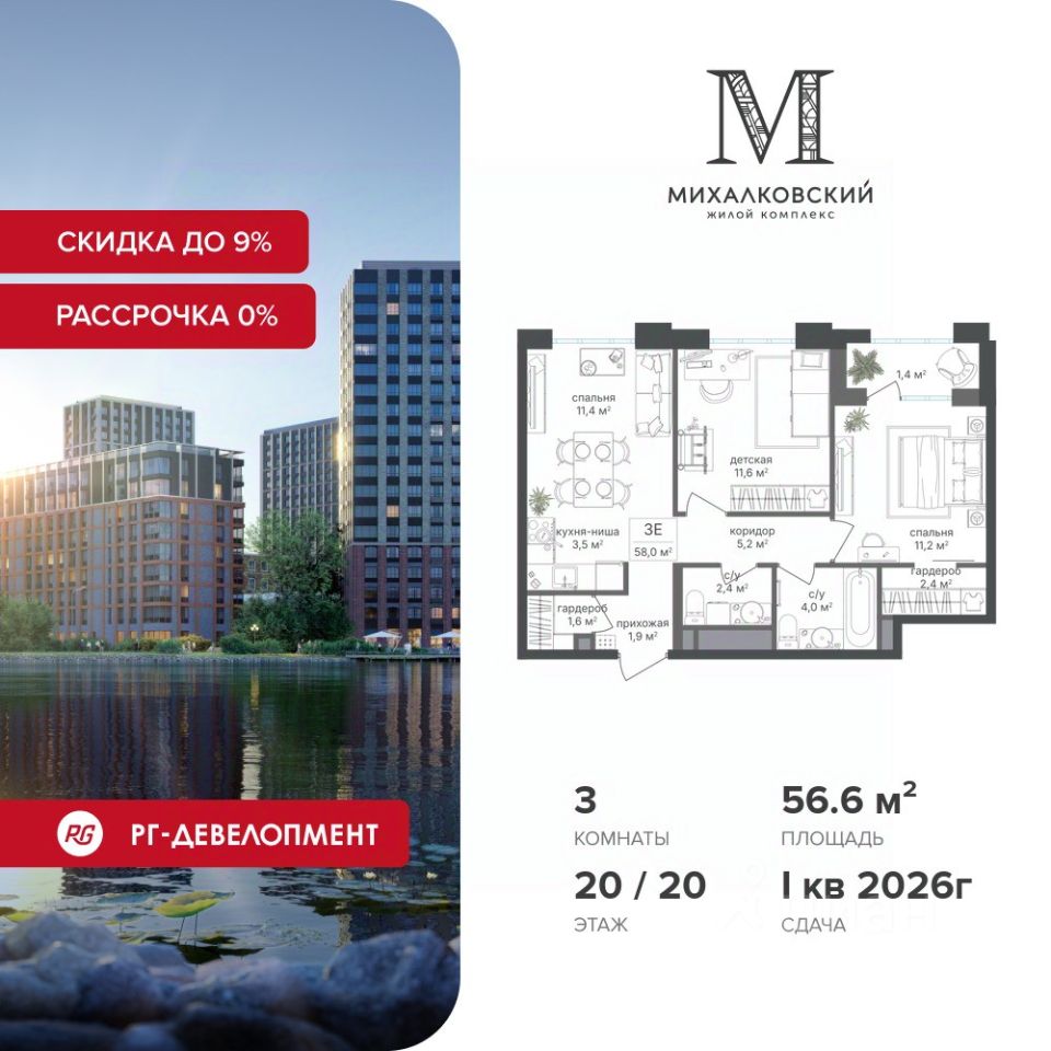 Продаётся 3-к квартира 56,6 кв.м. в ЖК "Михалковский" на 20-м этаже 20 этажного дома.