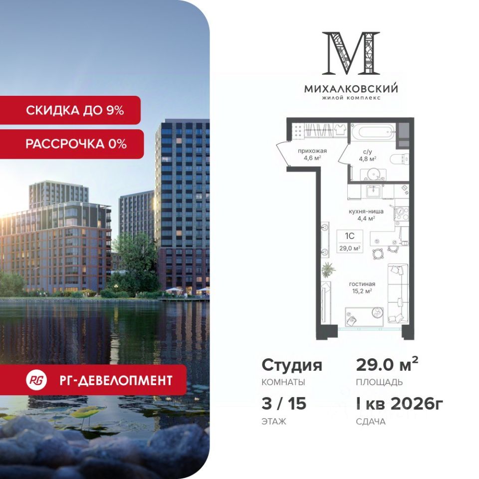 Продаётся студия 29,0 кв.м. в ЖК "Михалковский" на 3-м этаже 15 этажного дома.