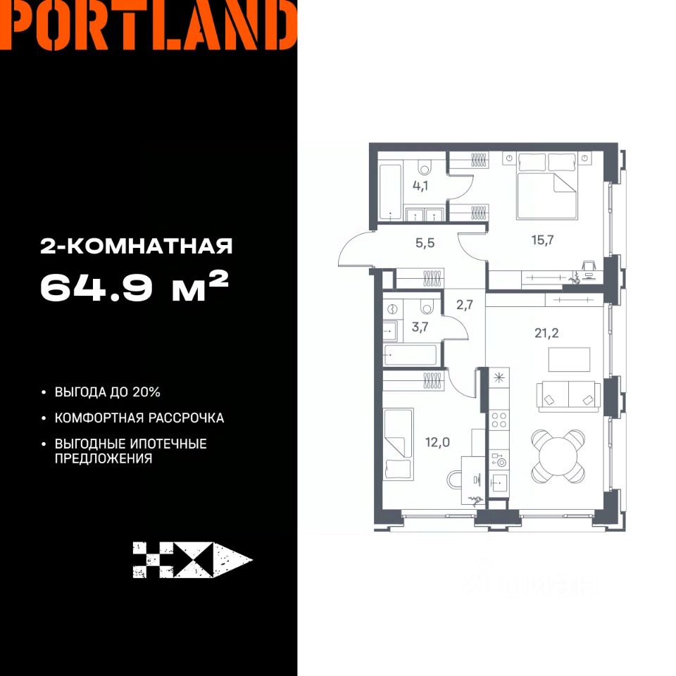 Продаётся 2-к. квартира, 11 этаж в жилом комплексе бизнес-класса Portland от девелопера FORMA. ЖК расположен на берегу Москвы-реки в северной части района Печатники в акватории Южного речного порта.