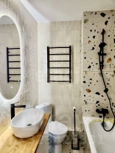 Санузел: Площадь оптимизирована, установлена ванна. Отделка включает столешницу из мрамора.