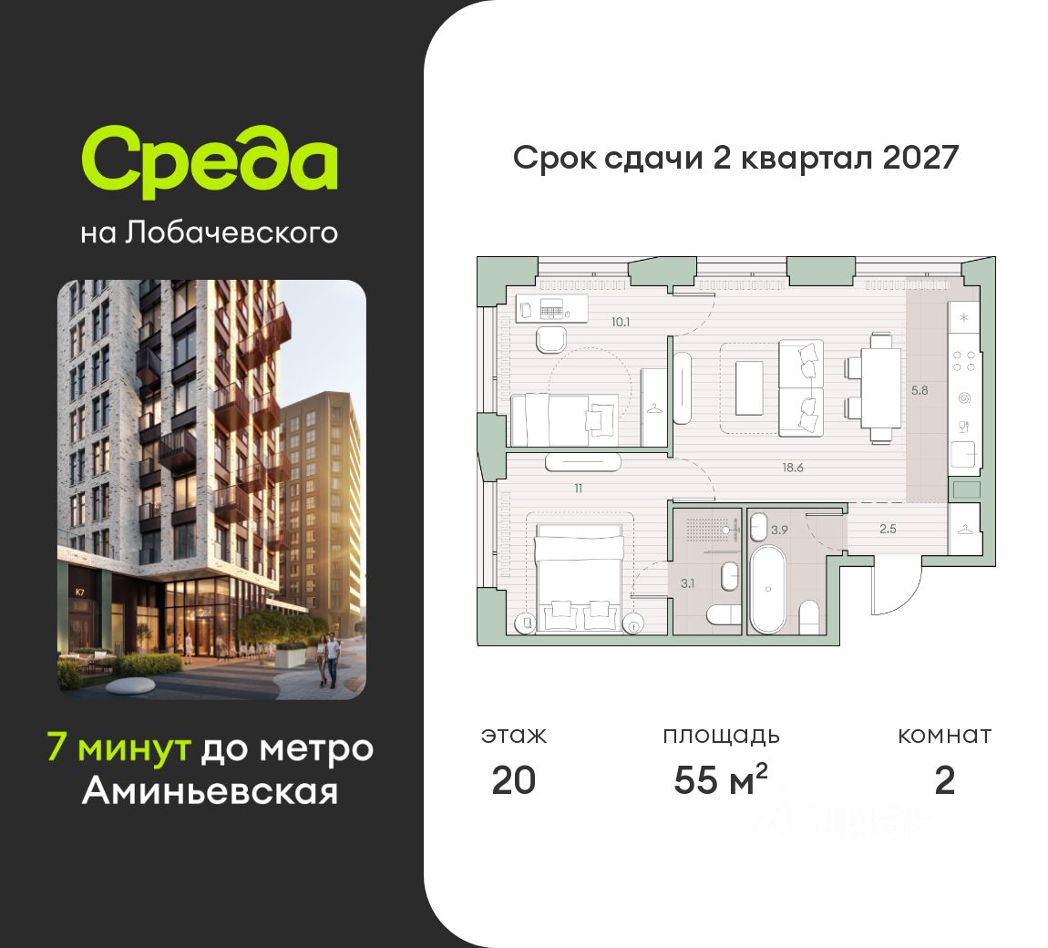 Продаётся 2-комнатная квартира общей площадью 55 кв.м. с отделкой white box. Квартира расположена на 20 этаже корпуса 5.4 в жилом комплексе бизнес-класса "Среда на Лобачевского" в пешей доступности от метро "Аминьевская".