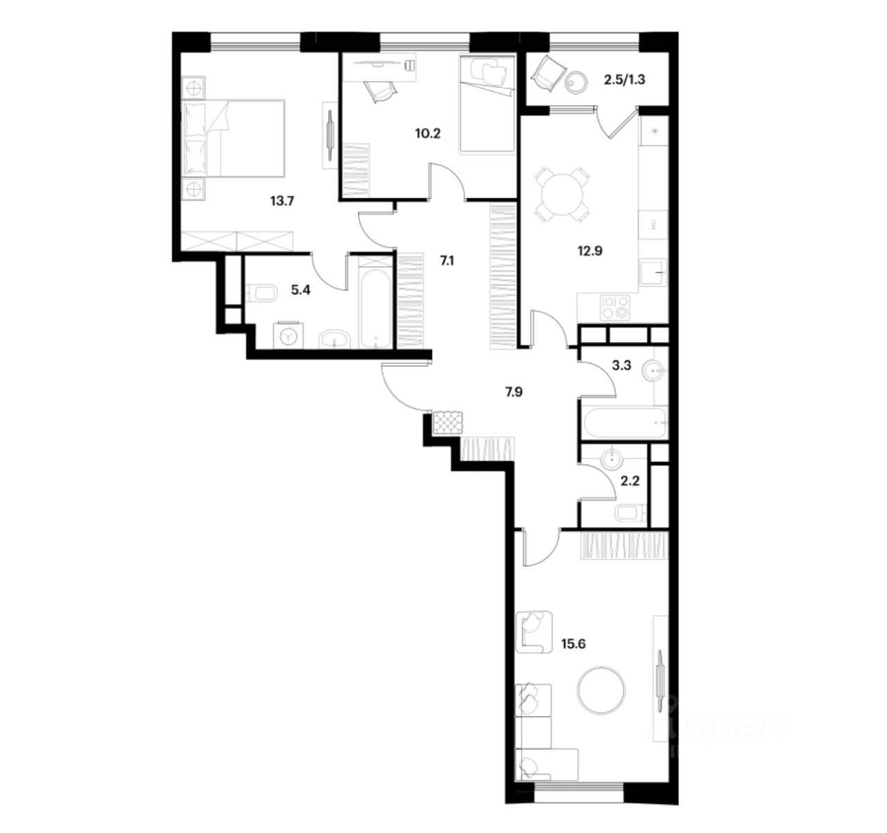 Площадь комнат - 15.6-13.7-10.2м.кв.