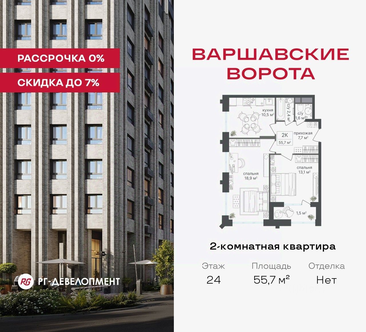 Продаётся 2-комнатная квартира 55,7 кв.м. в МФК "Варшавские ворота" на 24-м этаже 30 этажного дома. МФК "Варшавские ворота" — это точка баланса между природой и городом, стилем и функциональностью, жизнью сегодня и устойчивым будущим.