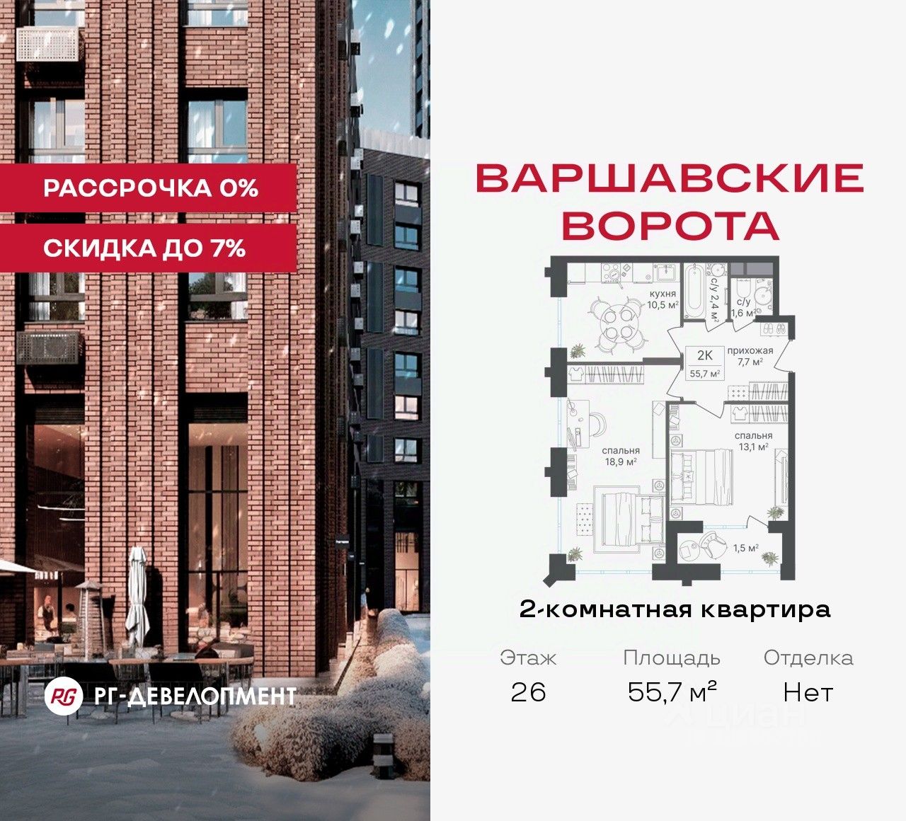 Рассрочка 0% + скидка 5%. Первый платёж 50% при ДДУ, второй 50% — через 12 мес. до ввода ЖК.