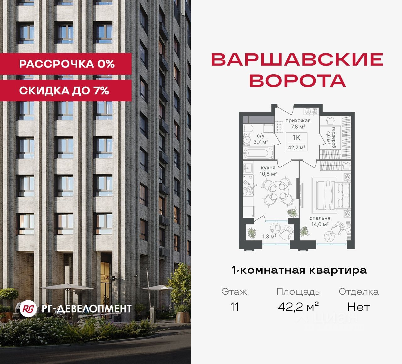 Продаётся 1-комнатная квартира 42,2 кв.м. в МФК "Варшавские ворота" на 11-м этаже 30 этажного дома. МФК "Варшавские ворота" — это точка баланса между природой и городом, стилем и функциональностью, жизнью сегодня и устойчивым будущим.