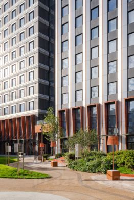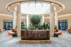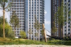 Внешняя территория комплекса условно делится на три зоны. Основная входная группа представляет собой открытую зону коммерческих помещений (кофейня, аптека, салон красоты). В закрытой зоне внутреннего двора время течет как в замедленной съемке. Скамейки, шезлонги, пуфы, садовые качели приглашают расслабленно провести часок-другой наедине с собой или в небольшой компании. В восточной части территории расположены игровые площадки для детей разных возрастов, а также спортивные площадки. Авторам проекта архитектурному бюро ICube удалось воссоздать атмосферу детских фильмов!