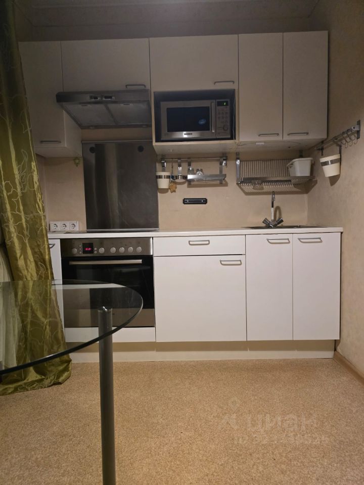 Кухня почти квадратной формы, на кухне не большой диван. Просторная комната 19 м2, лоджия застеклена, дорога далеко, достаточно тихо.