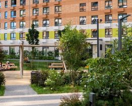 На первых этажах разместятся магазины и различные сервисы услуг. В зелёных дворах без автомобилей будут обустроены детские площадки и места для отдыха.