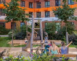 На первых этажах разместятся магазины и различные сервисы услуг. В зелёных дворах без автомобилей будут обустроены детские площадки и места для отдыха.