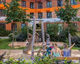 На первых этажах разместятся магазины и различные сервисы услуг. В зелёных дворах без автомобилей будут обустроены детские площадки и места для отдыха.