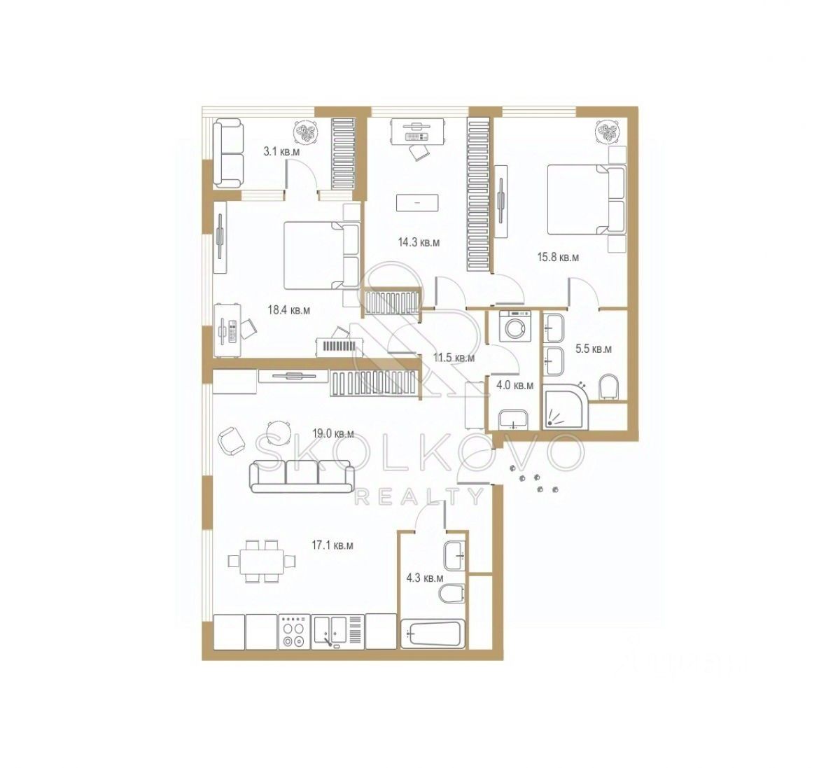 Эта просторная и функциональная квартира с продуманной планировкой включает в себя: