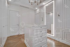 Декоративная лепнина и латунные элементы для подчеркивания классического стиля.