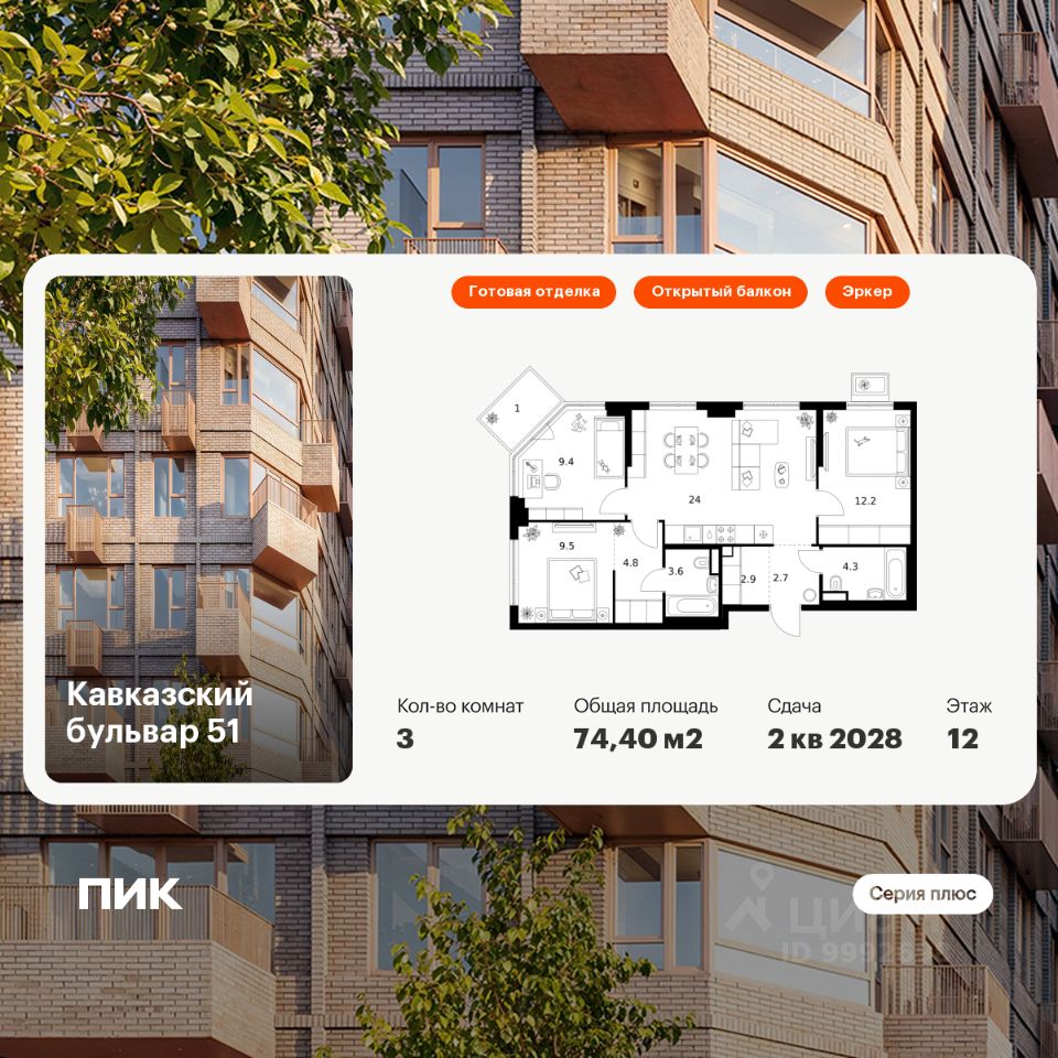 Продаётся 3-комн. квартира площадью 74,4 кв.м на 12 этаже 23 этажного дома (Корпус 3.2, Секция 2) проекта ПИК Кавказский бульвар 51. Светлый просторный подъезд на уровне земли, функциональная планировка, большие окна, c отделкой.