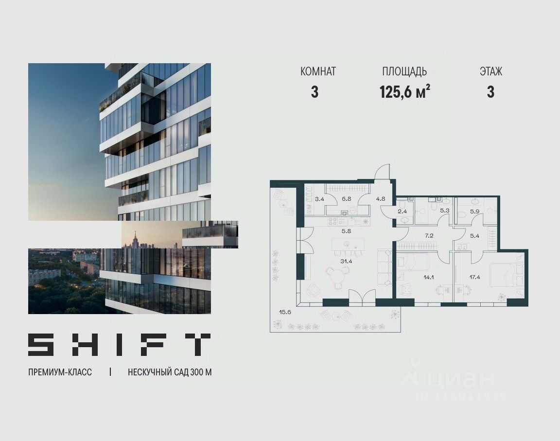 3-к квартира в премиальном комплексе SHIFT на 3-м этаже в 18 этажном здании. Общая площадь 125.6 кв. м.