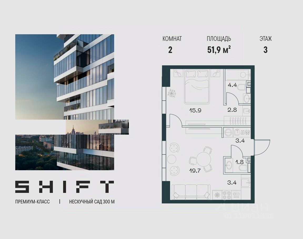 2-к квартира в премиальном комплексе SHIFT на 3-м этаже в 18 этажном здании. Общая площадь 51.9 кв. м.