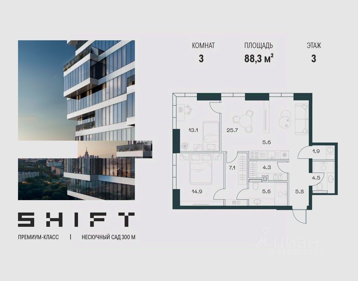 3-к квартира в премиальном комплексе SHIFT на 3-м этаже в 18 этажном здании. Общая площадь 88.3 кв. м.