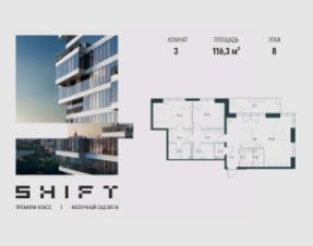 3-к квартира в премиальном комплексе SHIFT на 8-м этаже в 18 этажном здании. Общая площадь 116.3 кв. м.