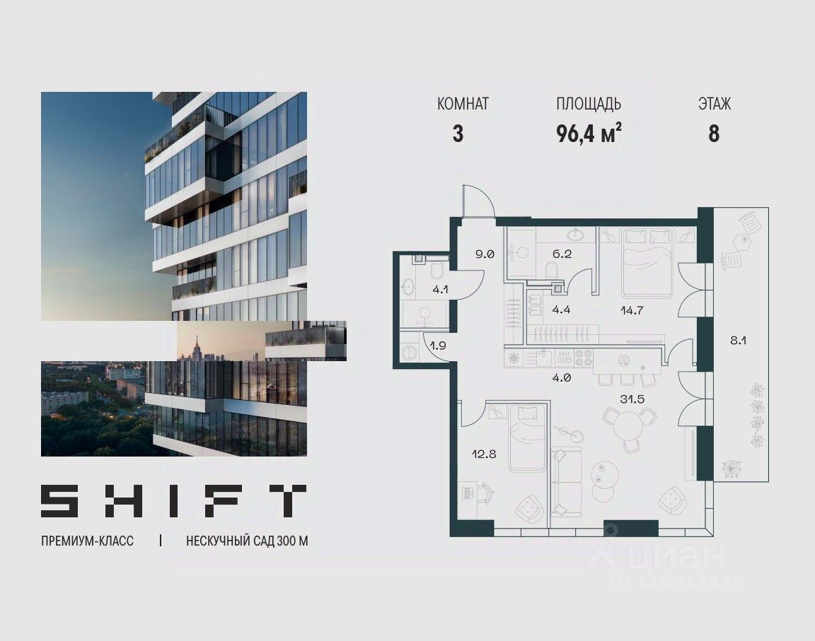 3-к квартира в премиальном комплексе SHIFT на 8-м этаже в 18 этажном здании. Общая площадь 96.4 кв. м.