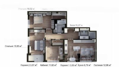 — Уютная планировка: две спальни, кабинет, просторная кухня-гостиная, два санузла — всё зонировано через общий коридор для максимального комфорта.