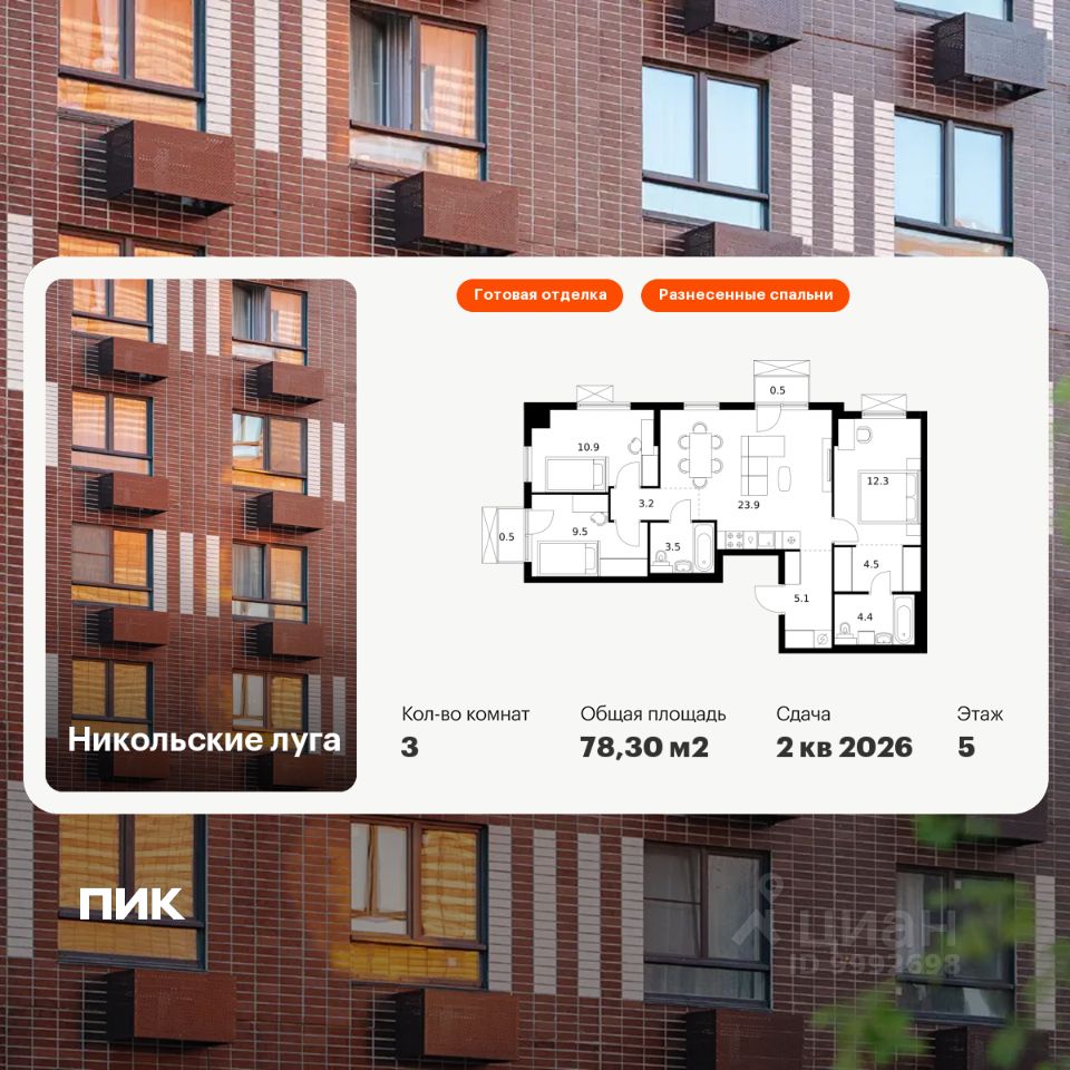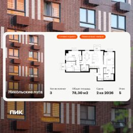Продаётся 3-комн. квартира площадью 78,3 кв.м на 5 этаже 17 этажного дома (Корпус 4, Секция 3) проекта ПИК Никольские луга. Светлый просторный подъезд на уровне земли, функциональная планировка, большие окна, c отделкой.