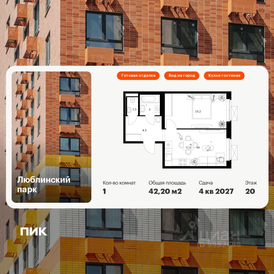 Продаётся 1-комн. квартира площадью 42,2 кв.м на 20 этаже 25 этажного дома (Корпус 18-20, Секция 2) проекта ПИК Люблинский парк. Светлый просторный подъезд на уровне земли, функциональная планировка, большие окна, c отделкой.