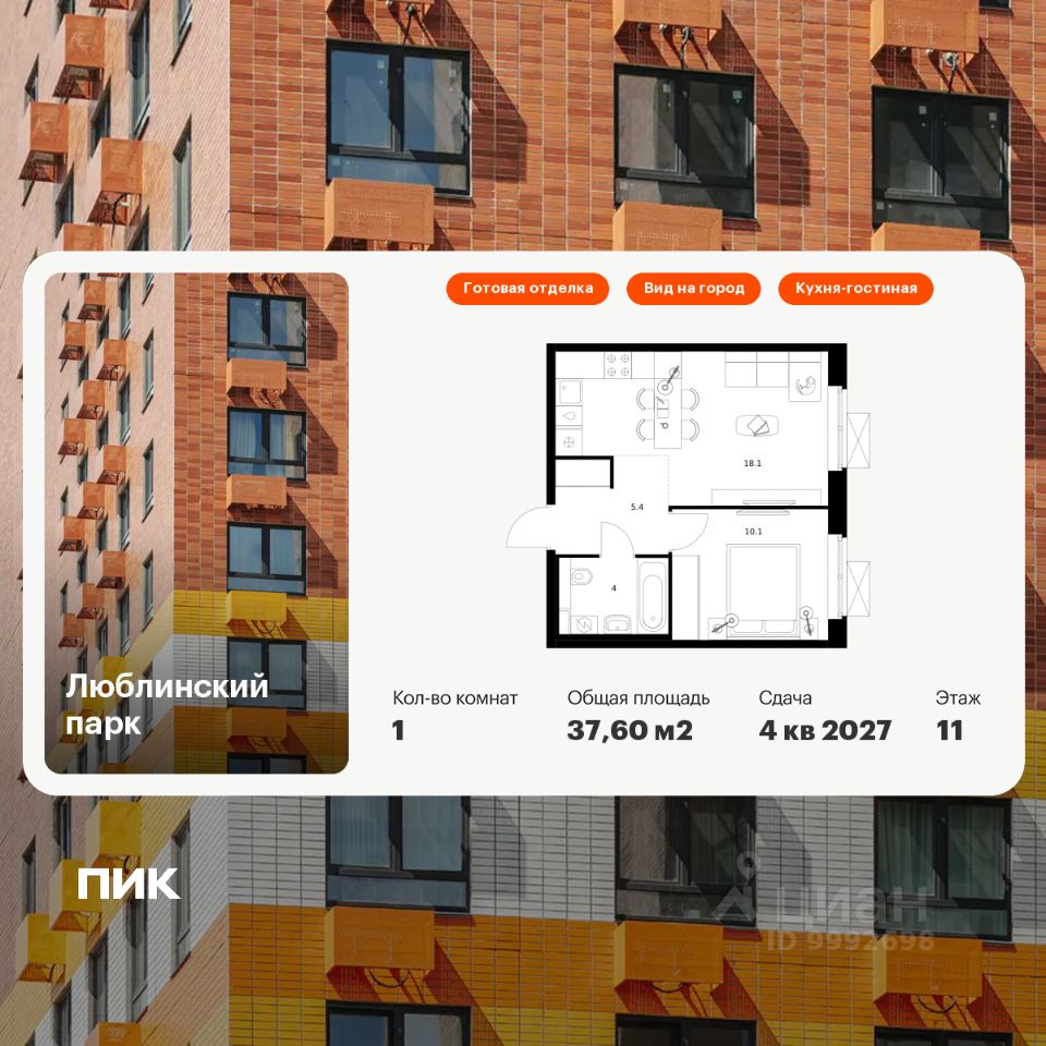 Продаётся 1-комн. квартира площадью 37,6 кв.м на 11 этаже 25 этажного дома (Корпус 18-20, Секция 2) проекта ПИК Люблинский парк. Светлый просторный подъезд на уровне земли, функциональная планировка, большие окна, c отделкой.