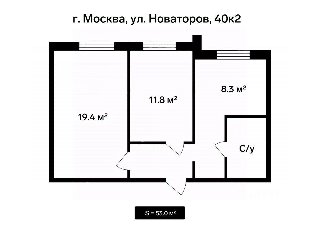 • Планировка: 2 изолированные комнаты (19,4 м² + 11,8 м²), кухня 9 м², совмещенный санузел