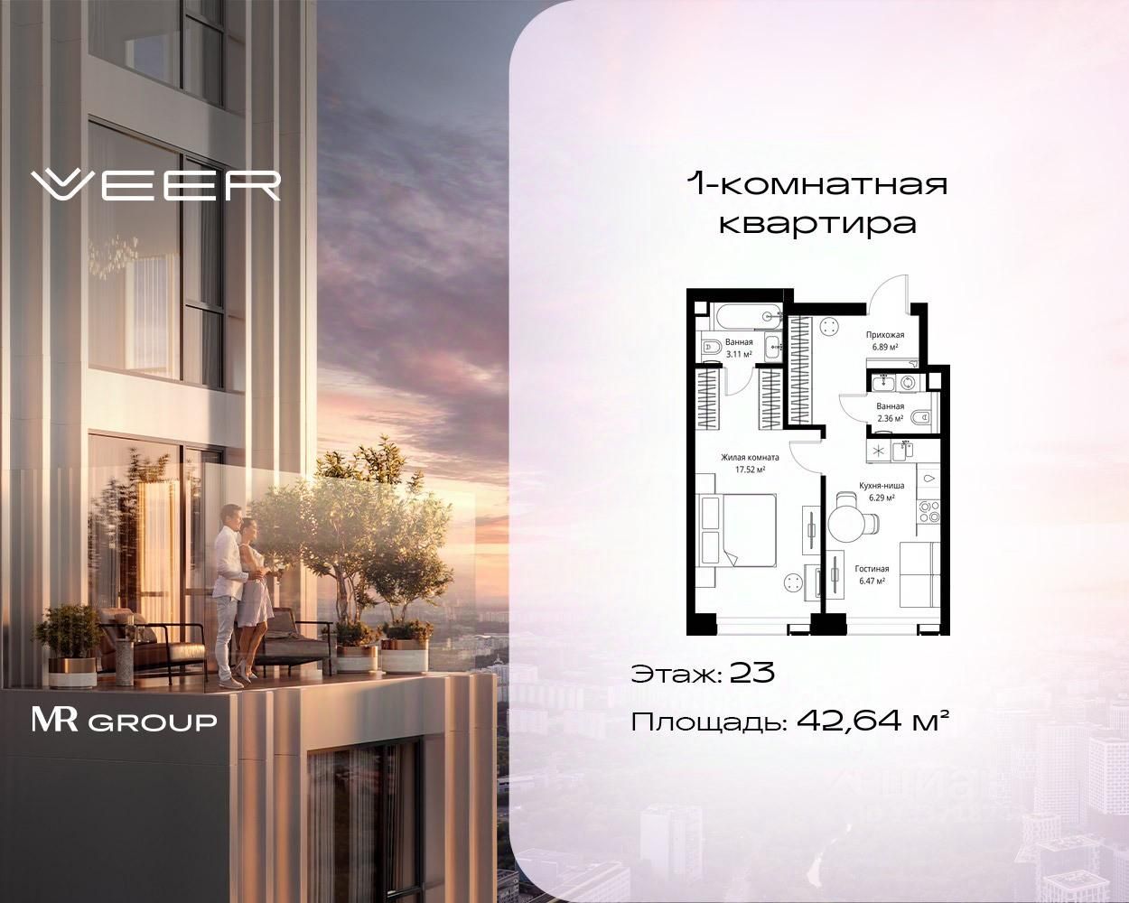 Продаётся 1-комнатная квартира общей площадью 42.64 м² без отделки в ЖК VEER на 23-м этаже 35 этажного дома.