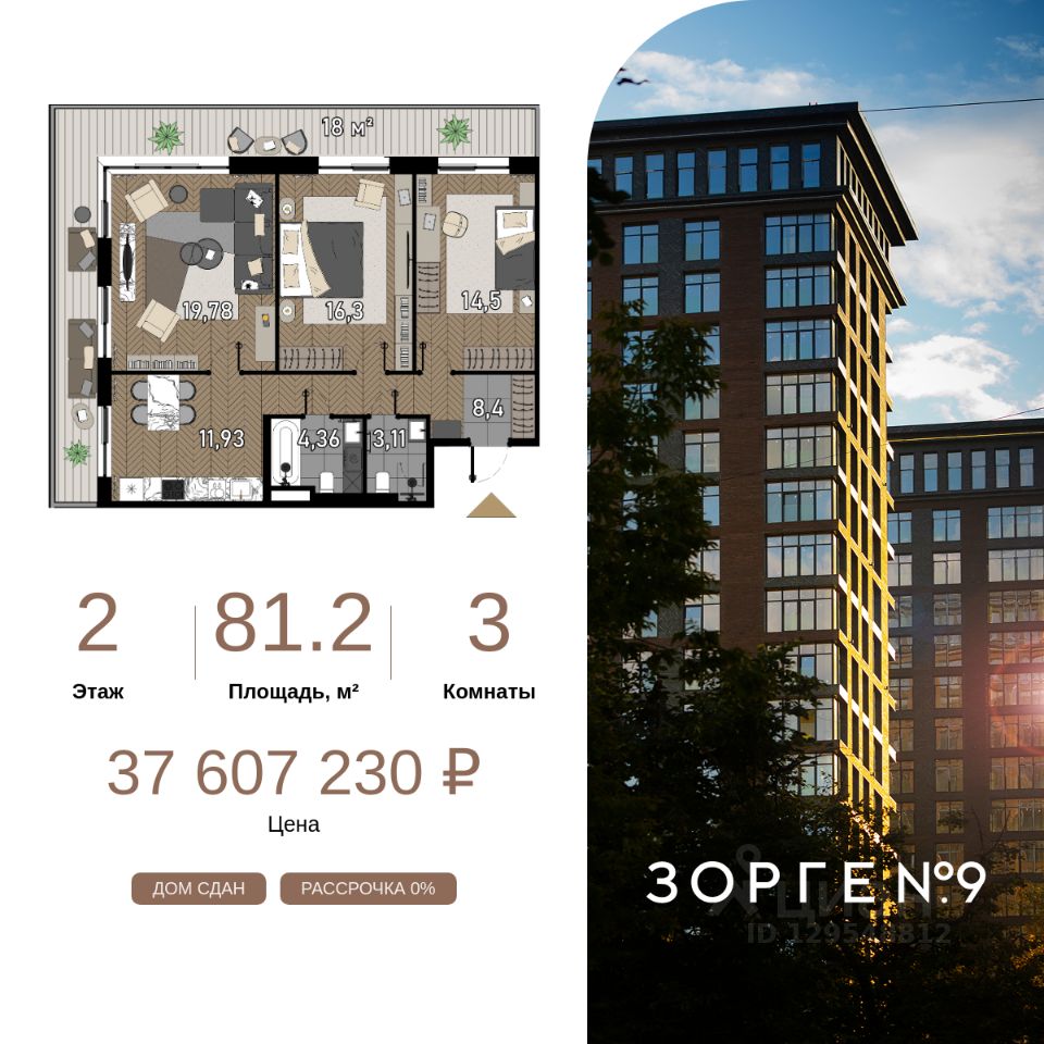 "Зорге 9" — готовые апартаменты бизнес-класса на Ходынке. 10 минут до Москва-Сити. Архитектура: 3 современных корпуса с фасадами в стиле архитектуры Нью-Йорка и с сервисами премиальных отелей, высотой до 23 этажа. Строгие линии, панорамные окна создают ощущение неподдельной роскоши и комфортной жизни в сердце мегаполиса. Проект награжден авторитетной премией European Property Awards. Резиденции: Свободная планировка, небольшая глубина этажа, огромные панорамные окна в пол до 3,6 м и высота потолков до от 3,3 до 4,3 м позволяют реализовать самые смелые концептуальные идеи и создать идеальный интерьер с учетом всех пожеланий. Вдохновляющие виды на город украсят ваш апартамент лучше любой картины. Есть возможность приобретения дизайн-проекта и полной меблировки апартаментов от партнеров девелопера. Расположение: 3 мин. пешком до парка Березовая роща 10 мин. пешком до Ходынского поля 10 мин. до ТЦ Авиапарк 30 минут до Шереметьево 10 мин до Москва-Сити или 1 станция до Москва-Сити 5 минут до ТТК 4 станции метро в шаговой доступности: 6 мин м. Полежаевская (фиолетовая ветка) 7 мин МЦК Зорге (МЦК) 7 мин м. Хорошевская (голубая ветка) 10 мин МЦК Хорошёво (МЦК) Благоустройство: Собственный парк 2 га с амфитеатром и поющими фонтанами. В парке высажено 136 деревьев и более 11 000 кустов и мелких растений из немецких питомников. Площадка для йоги и воркаут-зона со спортивными площадками. Теннисные столы и детский плейхаб Две башни Авторское гранд-лобби В лобби предусмотрена лаундж-зона, чайная с камином, комната для хранения велосипедов и колясок. Доступ по системе FACE ID. В отделке лобби и лифтовых холлов использован декоративный камень итальянского бренда Atlas Concorde Пентхаусы На верхнем уровне комплекса расположены роскошные просторные пентхаусы с высотой потолка до 4,2 метра и панорамными окнами до 3,6 метров, открывающими великолепные виды на столицу. Пентхаусы с выходами на собственные приватные террасы на кровле, площадью от 150 кв. м являются жильем high-уровня, демонстрирующим высокий статус владельца.