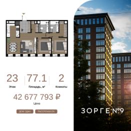 "Зорге 9" — готовые апартаменты бизнес-класса на Ходынке. 10 минут до Москва-Сити. Архитектура: 3 современных корпуса с фасадами в стиле архитектуры Нью-Йорка и с сервисами премиальных отелей, высотой до 23 этажа. Строгие линии, панорамные окна создают ощущение неподдельной роскоши и комфортной жизни в сердце мегаполиса. Проект награжден авторитетной премией European Property Awards. Резиденции: Свободная планировка, небольшая глубина этажа, огромные панорамные окна в пол до 3,6 м и высота потолков до от 3,3 до 4,3 м позволяют реализовать самые смелые концептуальные идеи и создать идеальный интерьер с учетом всех пожеланий. Вдохновляющие виды на город украсят ваш апартамент лучше любой картины. Есть возможность приобретения дизайн-проекта и полной меблировки апартаментов от партнеров девелопера. Расположение: 3 мин. пешком до парка Березовая роща 10 мин. пешком до Ходынского поля 10 мин. до ТЦ Авиапарк 30 минут до Шереметьево 10 мин до Москва-Сити или 1 станция до Москва-Сити 5 минут до ТТК 4 станции метро в шаговой доступности: 6 мин м. Полежаевская (фиолетовая ветка) 7 мин МЦК Зорге (МЦК) 7 мин м. Хорошевская (голубая ветка) 10 мин МЦК Хорошёво (МЦК) Благоустройство: Собственный парк 2 га с амфитеатром и поющими фонтанами. В парке высажено 136 деревьев и более 11 000 кустов и мелких растений из немецких питомников. Площадка для йоги и воркаут-зона со спортивными площадками. Теннисные столы и детский плейхаб Две башни Авторское гранд-лобби В лобби предусмотрена лаундж-зона, чайная с камином, комната для хранения велосипедов и колясок. Доступ по системе FACE ID. В отделке лобби и лифтовых холлов использован декоративный камень итальянского бренда Atlas Concorde Пентхаусы На верхнем уровне комплекса расположены роскошные просторные пентхаусы с высотой потолка до 4,2 метра и панорамными окнами до 3,6 метров, открывающими великолепные виды на столицу. Пентхаусы с выходами на собственные приватные террасы на кровле, площадью от 150 кв. м являются жильем high-уровня, демонстрирующим высокий статус владельца.